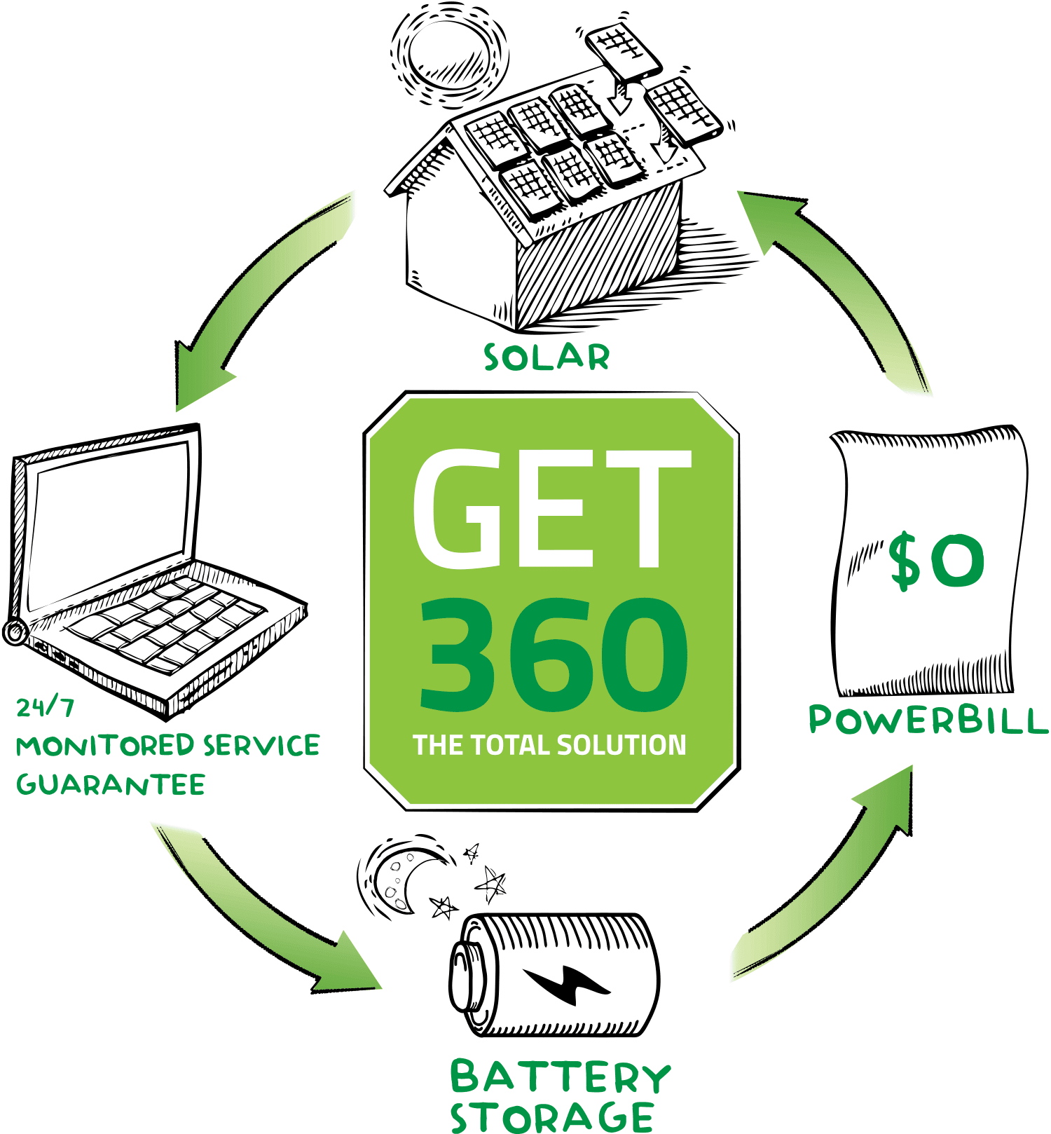 GET 360 is the ultimate in functionality, and involves combining solar power, 24/7 monitoring and battery night use together to result in a $0 power bill.